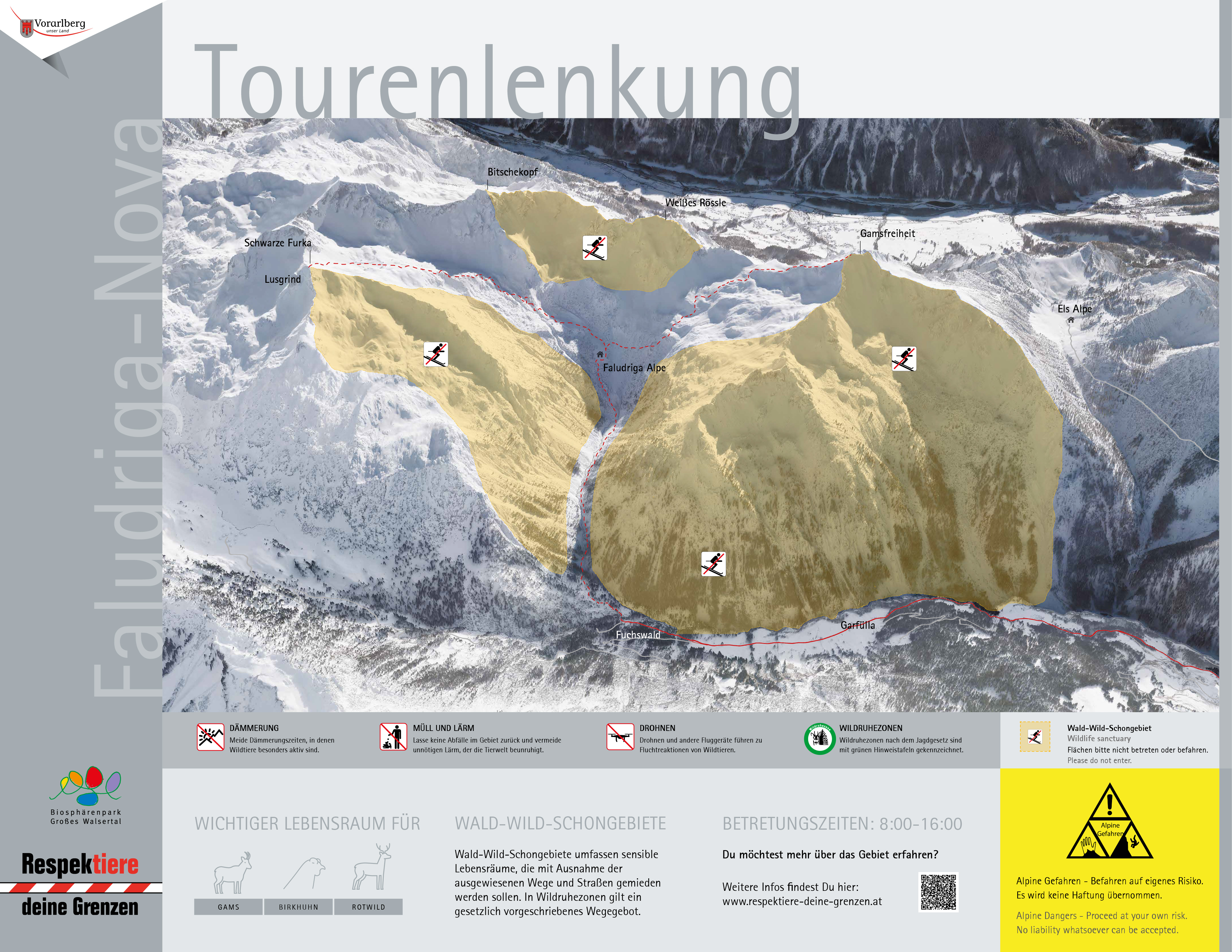 Skitouren sind sowohl im Aufstieg wie in der Abfahrt nur im Bereich außerhalb der in der Nutzungskarte (siehe unten) orange schraffierten Flächen und nur in der Zeit von 8:00 bis 16:00 Uhr erlaubt.