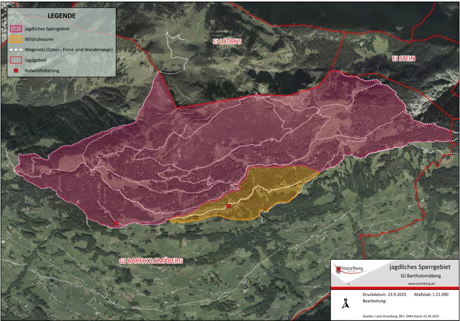 Bestimmung im Detail: Jagdliche Sperrgebiete dürfen mit Ausnahme bestehender Straßen, ausgewiesener Wanderwege, Skiabfahrten und Loipen nicht betreten werden (Jagdgesetz § 33, Abs. 1,2,4)